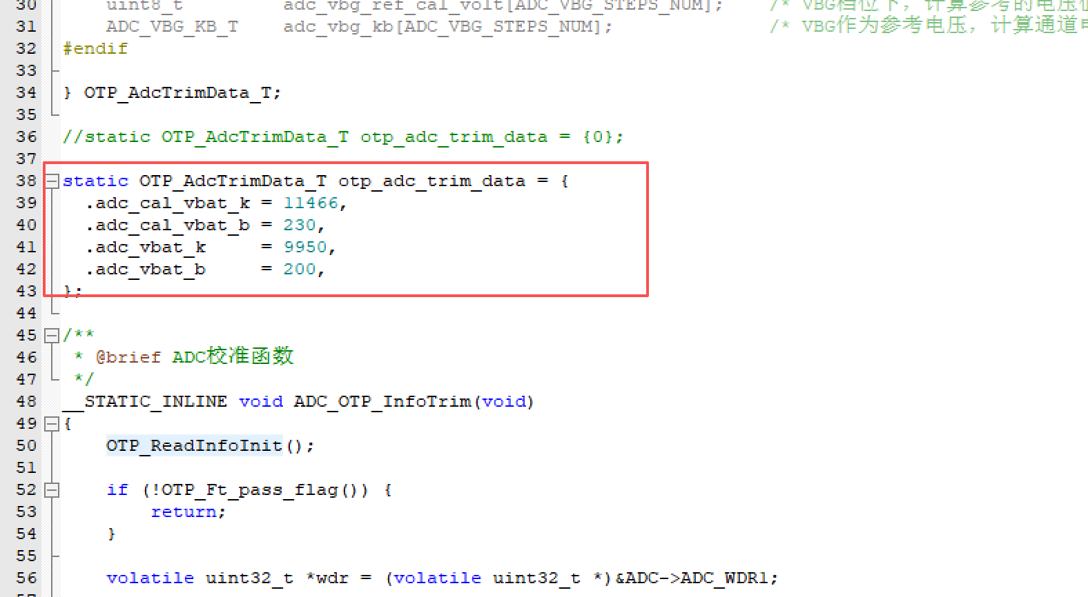 仿真板芯片为RAM版本芯片无法实现adc校准值存储功能,需要在adc校准函数里面手动赋一个初始值,v0.3.0之后的版本已经默认添加初始值。(OTP芯片无此问题,芯片出厂会进行校准,内部有校准值)